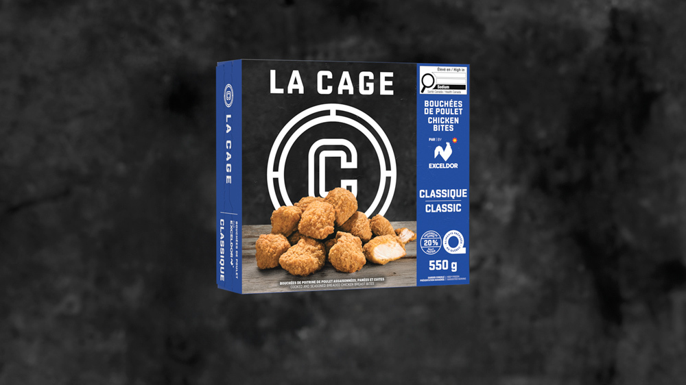 Poitrine de poulet, eau, farine de blé, chapelure de blé grillée, huile de canola et/ou soya, sel, amidon de pomme de terre, sucre, protéine de soya, amidon de maïs, farine de maïs, oignon déshydraté, extrait de levure, gluten de blé, ail déshydraté, épice, arôme naturel, caramel, extrait d’épice, sauce soya (soya, blé, sel), gomme de guar. Contient : Blé, soya