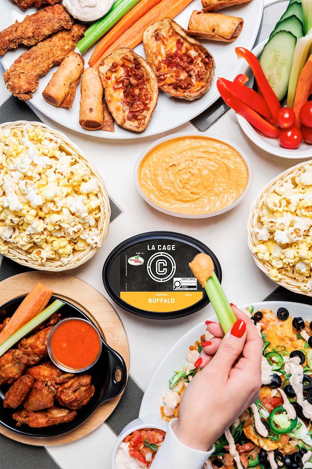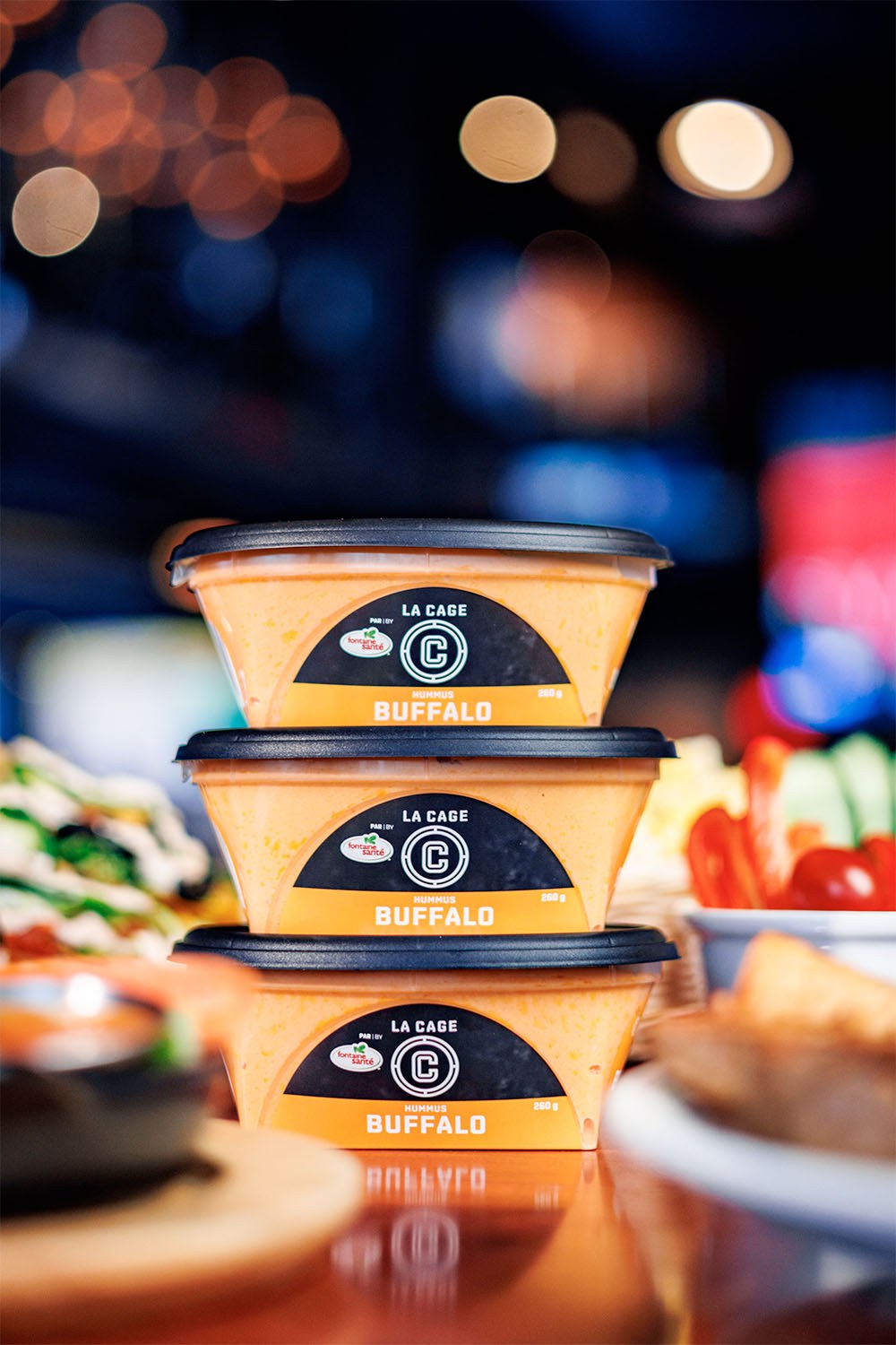 A bold reinvention of La Cage's classic Buffalo sauce, transformed into hummus. Spicy and vinegary, it retains the quality and texture of Fontaine Santé's renowned hummus. In collaboration with Fontaine Santé.