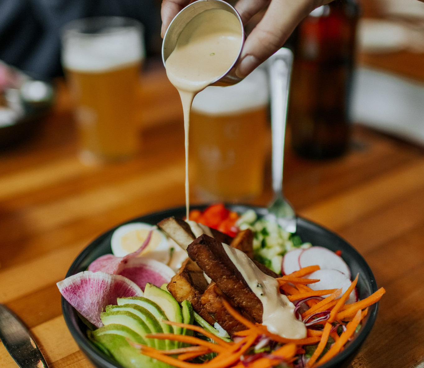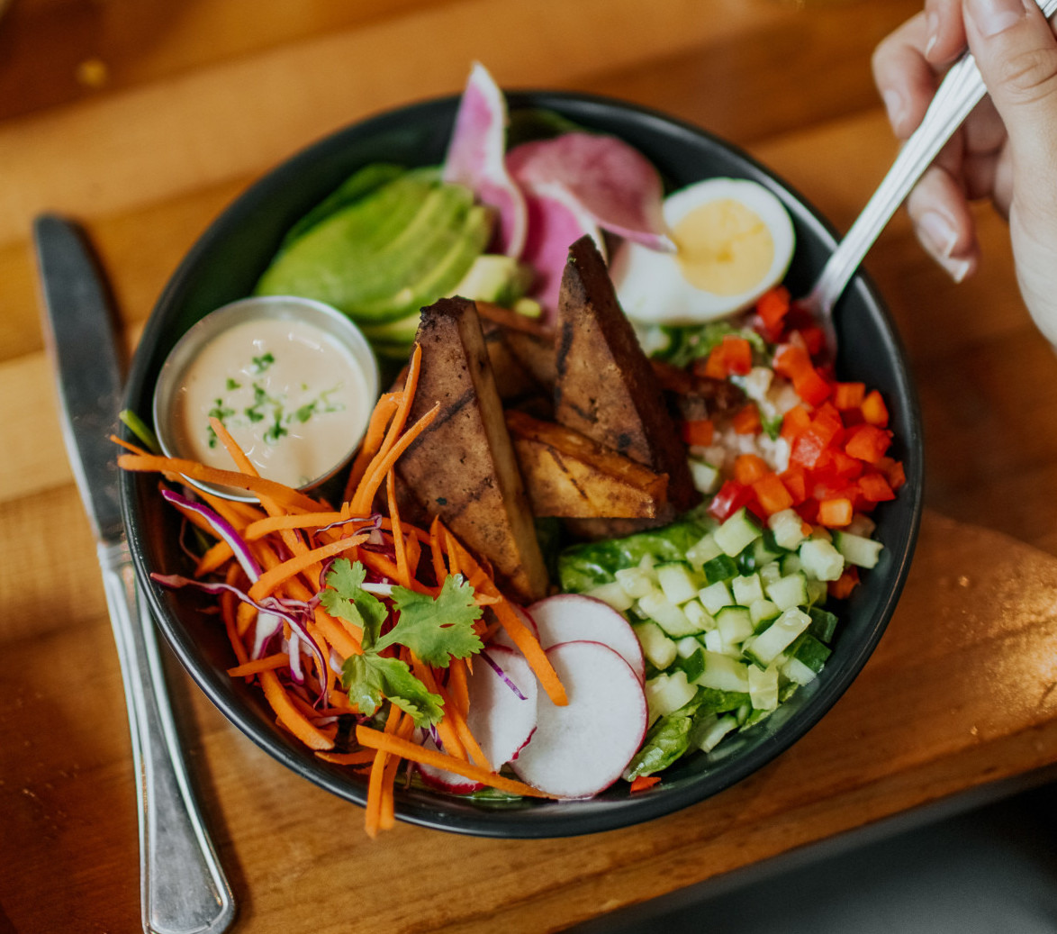 Marinated & grilled tofu, sticky rice, spring mix, lettuce mix, avocado, hard-boiled egg, green onion, edamame, cucumber, radish, melon radish, sweet pepper, mix of red cabbage, carrot and cilantro, toasted sesame seeds, spicy maple-sesame mayo