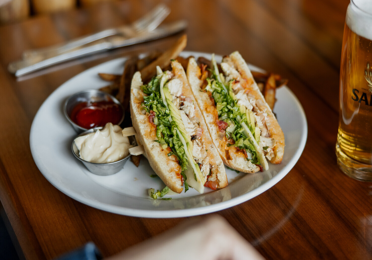 Marinated chicken breast from Québec, Havarti cheese, bacon, pico de gallo, romaine lettuce, avocado, house sauce, served with fries