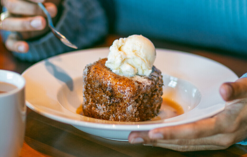 Crispy French toast, maple syrup and vanille ice cream.