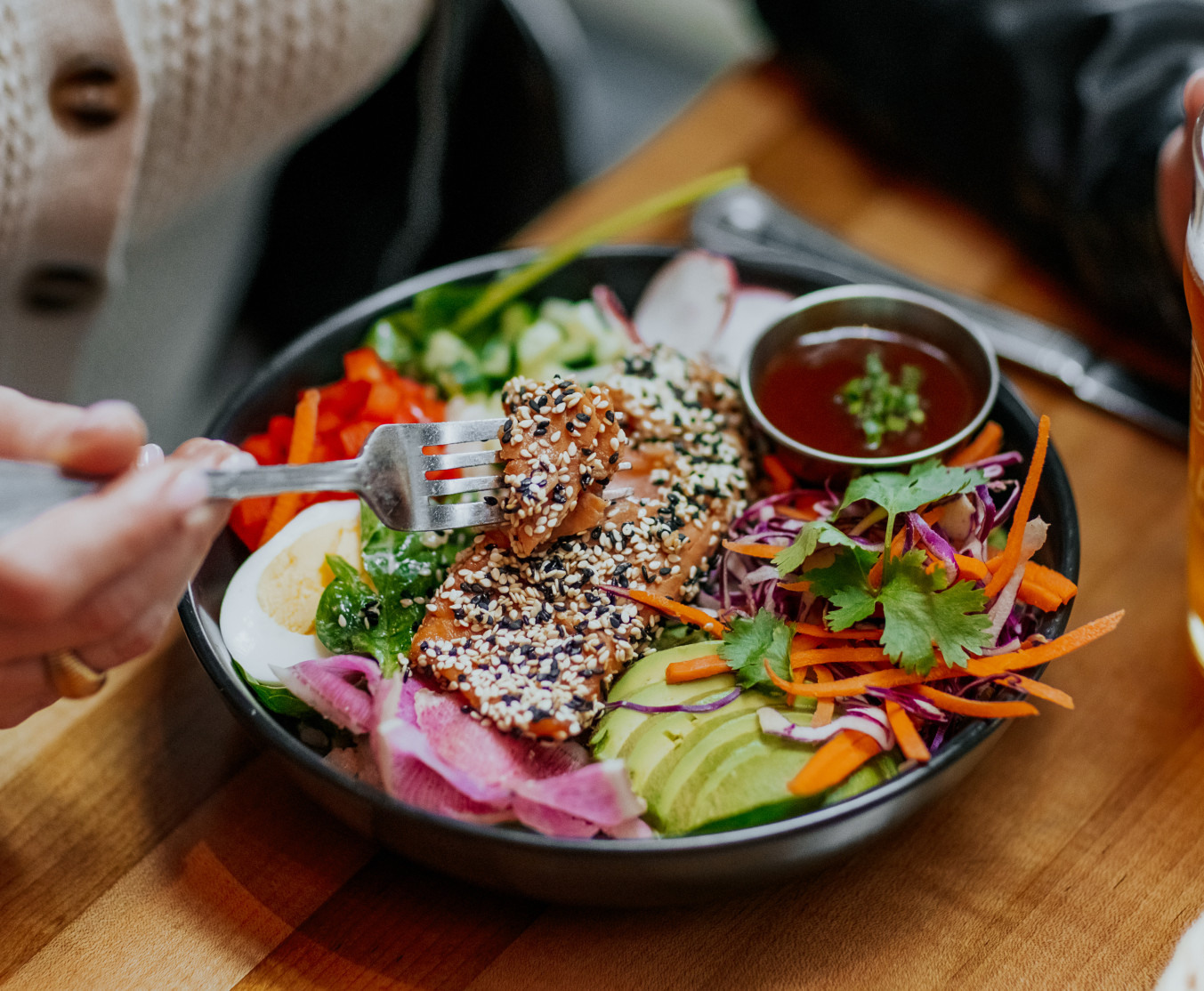 Sesame-crusted salmon tataki, sticky rice, avocado, soft-boiled egg, edamame, radish, melon radish, bell pepper, lettuce mix, red cabbage, carrot & cilantro mix, toasted sesame seeds, chopped chives, Capitaine Tao sauce.