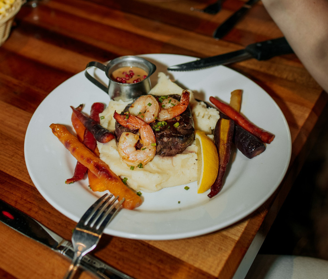 Filet mignon, garlic shrimp, homemade mashed potatoes, roasted carrots, house peppercorn sauce.
