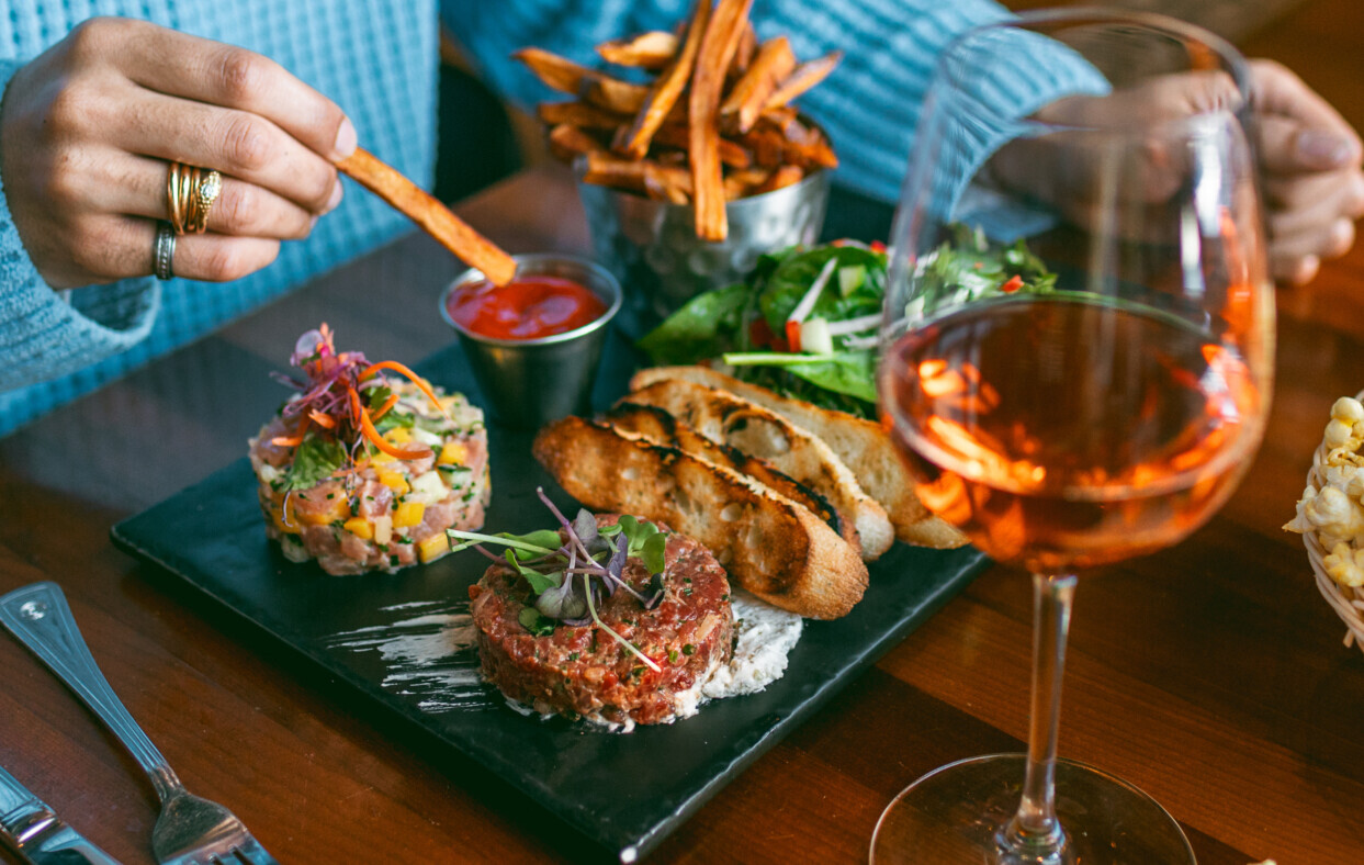 Tartares de saumon, de bœuf classique, et/ou de thon à l'asiatique servis avec croûtons de baguette grillée, salade verte et frites